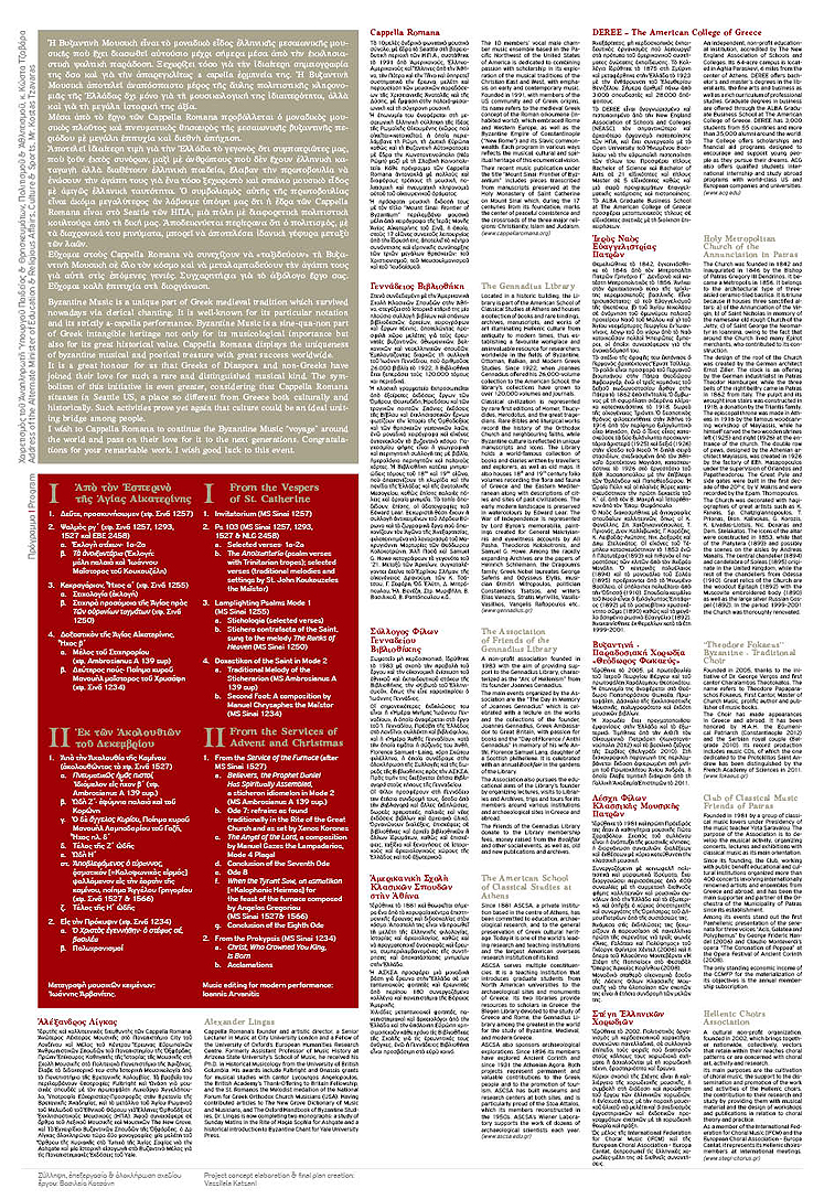 Ειδική μνεία γίνεται στην καταλυτική συνδρομή τών Cappella Romana, χάρη στην αφιλοκερδή προσφορά των οποίων υλοποιήθηκε το πρόγραμμα.