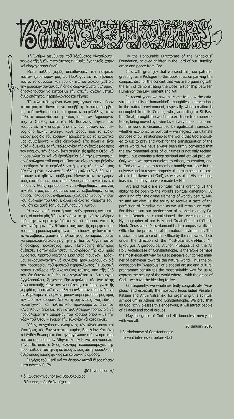 This musical edition is the worldwide premiere presentation of the special vespers service for the protection of the natural environment. The poetic text was created by the Monk Gerassimos Mikrayiannanitis (†1991).